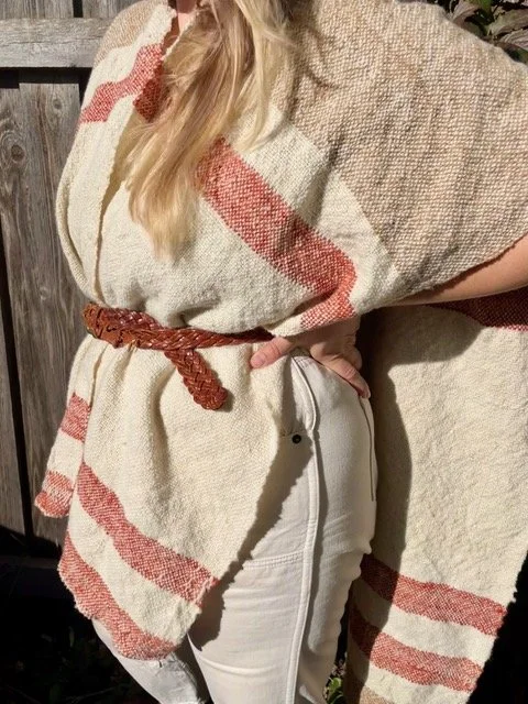 The shawl was made as a plain weave, 8 epi. Worked from the back to the front, split the warp at the shoulder and woven with two separate shuttles to finish the front panels.