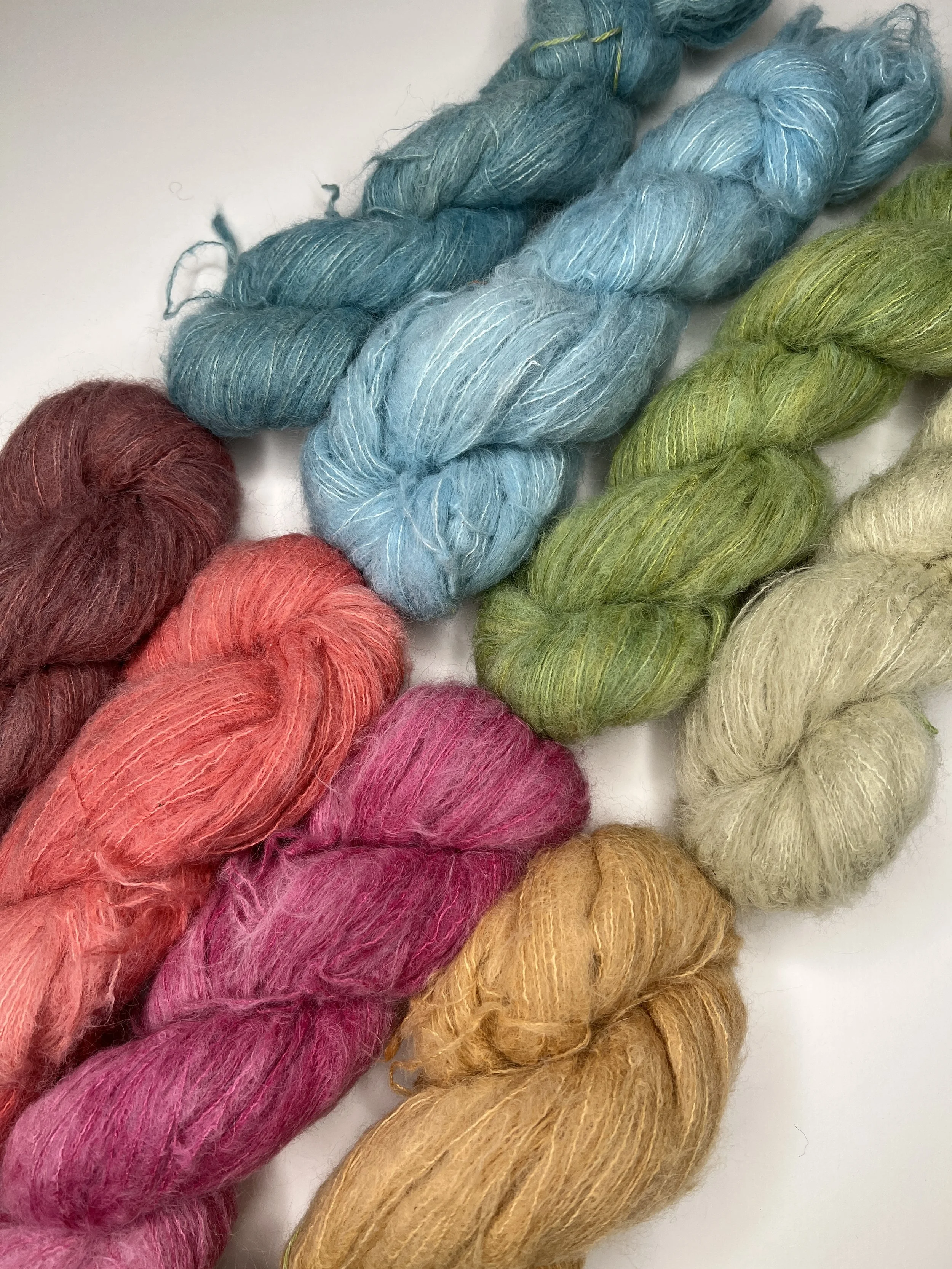 Offering: naturally dyed finished goods and supplies, including yarn, spinning fiber, dye kits, mending/embroidery thread, bandanas, and silk scarves.