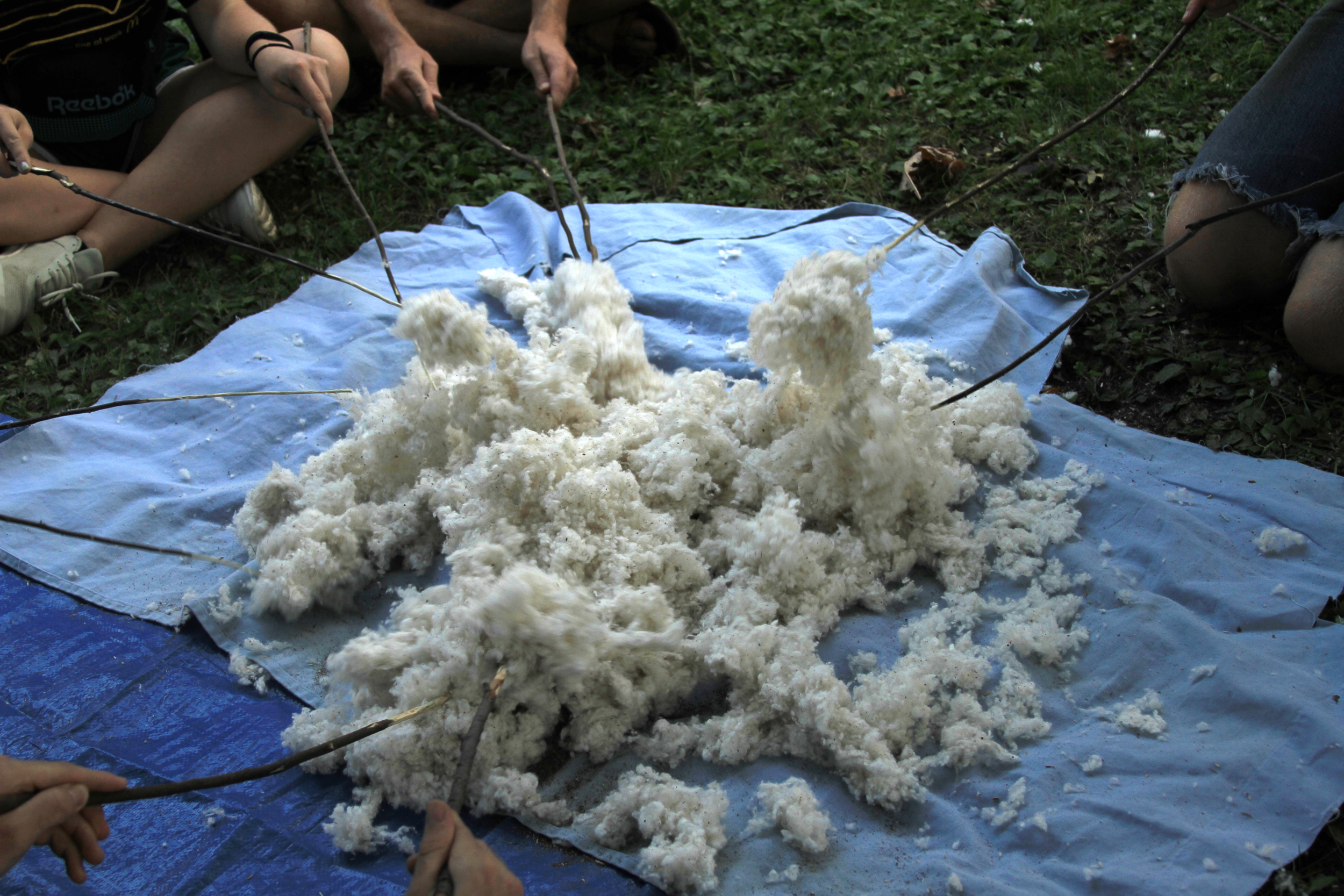 Fiber was scoured, rinsed, and then combed and carded it into roving before being spun into yarn.