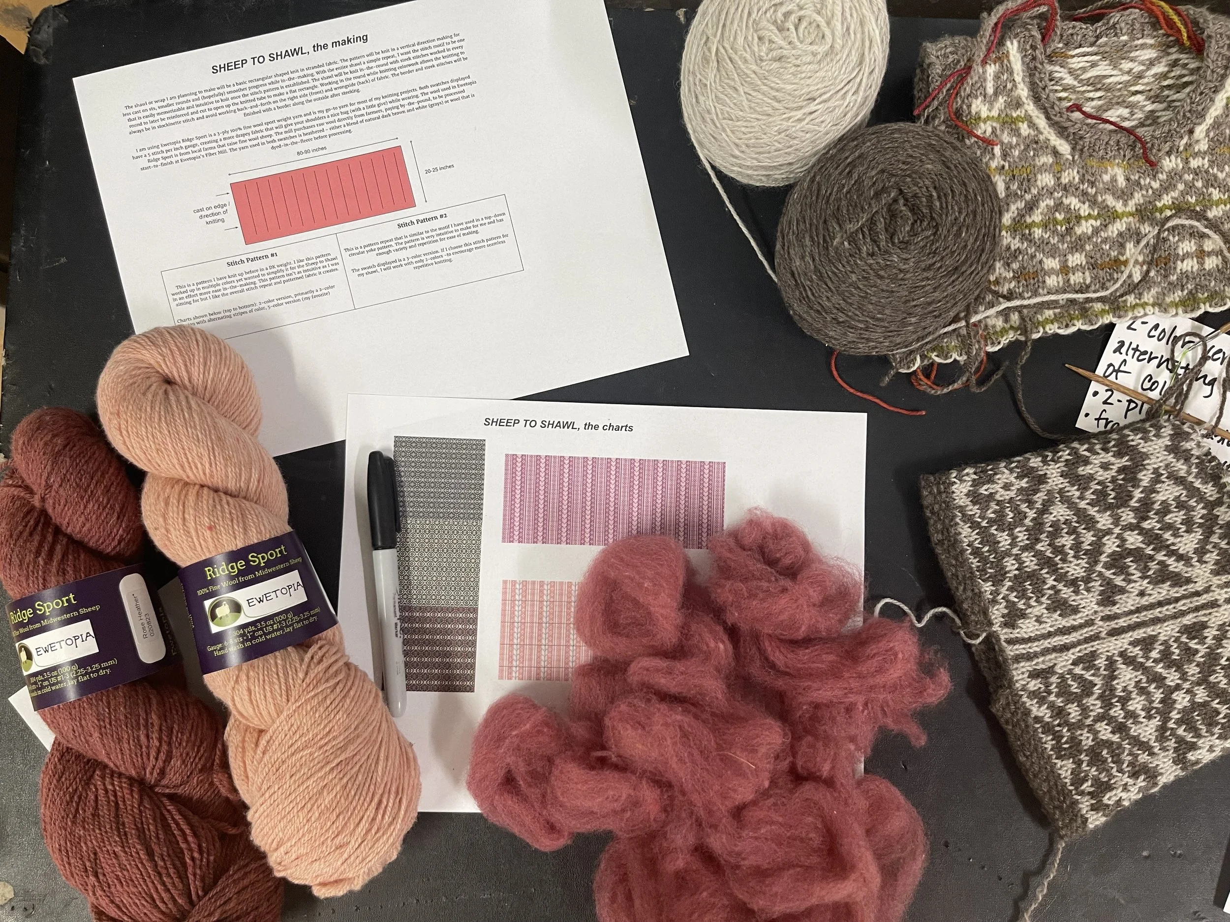 I will be making a knitted steeked, stranded rectangular shawl made with 3-ply sport weight fine wool yarn sourced from local farms and made at Ewetopia Fiber Mill. This yarn is purchased (payment to farmer per pound), skirted, scoured, dyed and processed start-to-finish in our local mill. The purchasing of the wool from local farms keeps our local sheep and their shepherds employed and (we hope) promotes continual fine wool production in our small midwestern region.